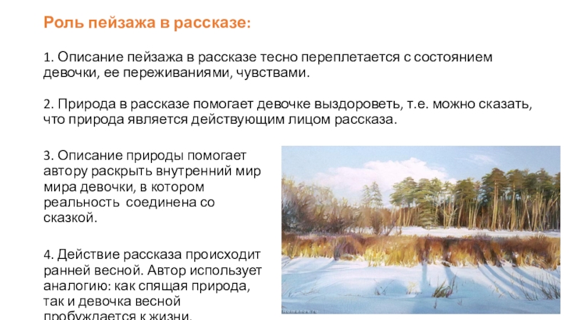 3. Описание природы помогает автору раскрыть внутренний мир мира девочки, в котором реальность соединена со сказкой.