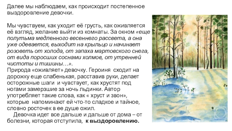 Природа «оживляет» девочку. Героиня сходит на дорожку еще слабенькая, расставив руки, делает осторожные шаги и чувствует, как хрустят под ногами замерзшие за ночь льдинки. Автор употребляет такие слова, как « хруст и звон», которые напоминают ей что-то сладкое и тайное, словно росточек в ее душе ожил.