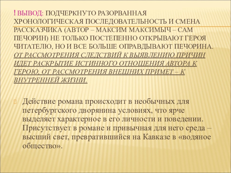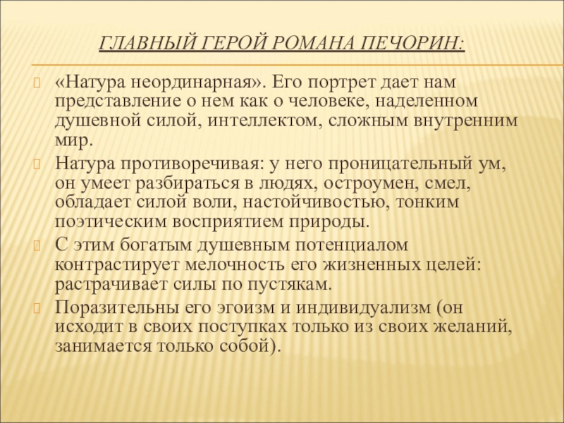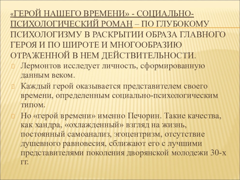 Но «герой времени» именно Печорин. Такие качества, как хандра, «охлажденный» взгляд на жизнь, постоянный самоанализ, эгоцентризм, отсутствие душевного равновесия, сближают его с лучшими представителями поколения дворянской молодежи 30-х гг.
