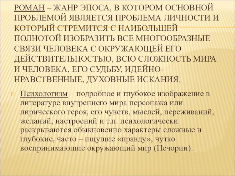 Психологизм – подробное и глубокое изображение в литературе внутреннего мира персонажа или лирического героя, его чувств, мыслей, переживаний, желаний, настроений и т.п. психологически раскрываются обыкновенно характеры сложные и глубокие, часто – ищущие «правду», чутко воспринимающие окружающий мир (Печорин).