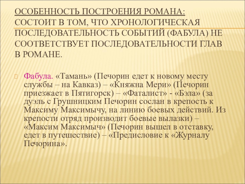 Фабула. «Тамань» (Печорин едет к новому месту службы – на Кавказ) – «Княжна Мери» (Печорин приезжает в Пятигорск) – «Фаталист» - «Бэла» (за дуэль с Грушницким Печорин сослан в крепость к Максиму Максимычу, на линию боевых действий. Из крепости отряд производит боевые вылазки) – «Максим Максимыч» (Печорин вышел в отставку, едет в путешествие) – «Предисловие к «Журналу Печорина».