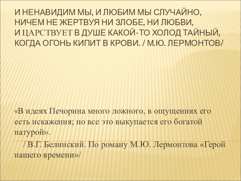 «В идеях Печорина много ложного, в ощущениях его есть искажения; но все это выкупается его богатой натурой».