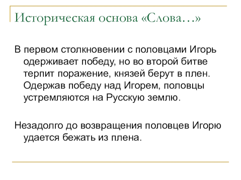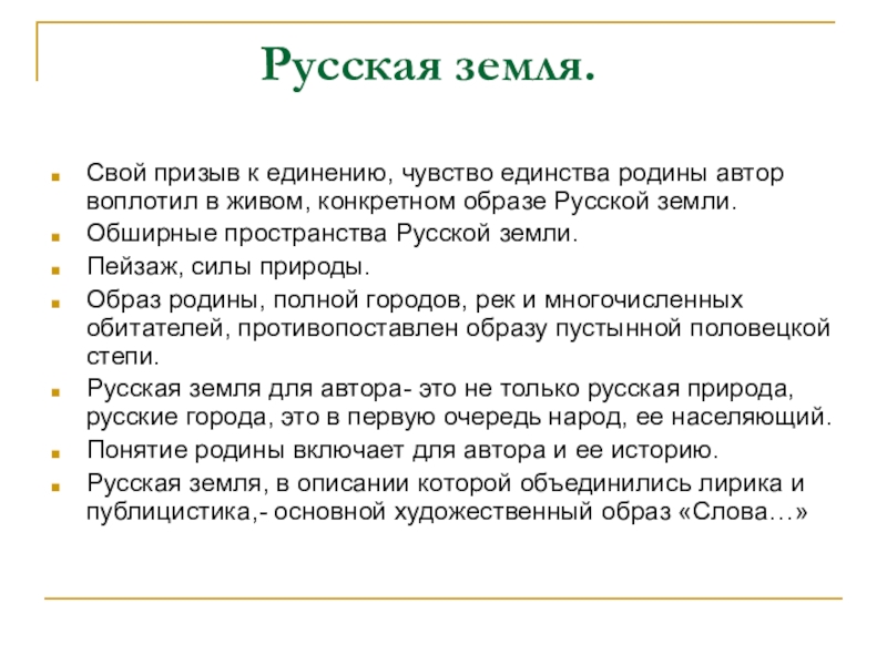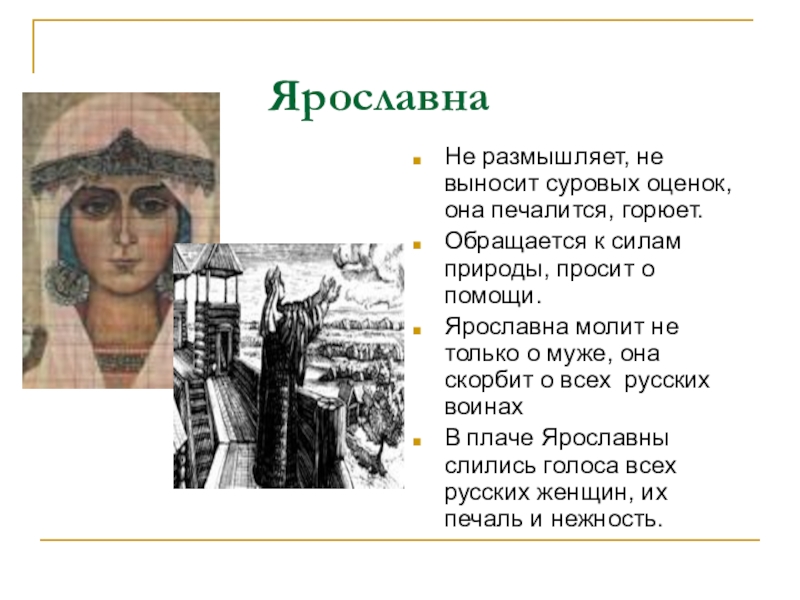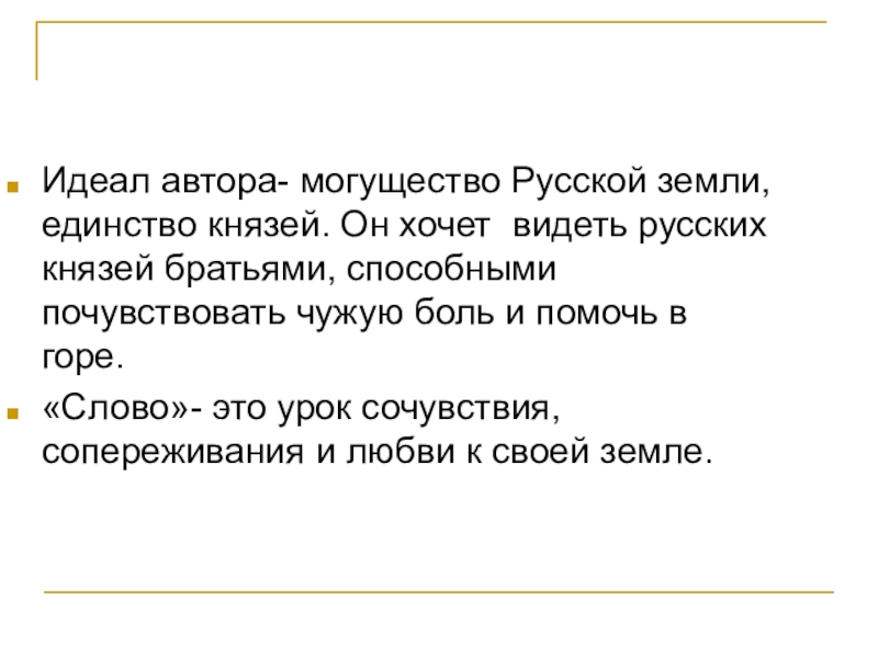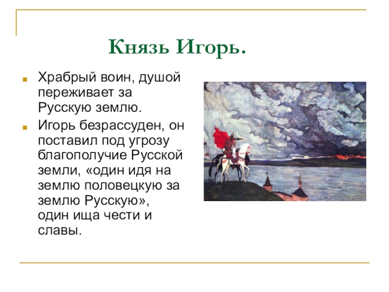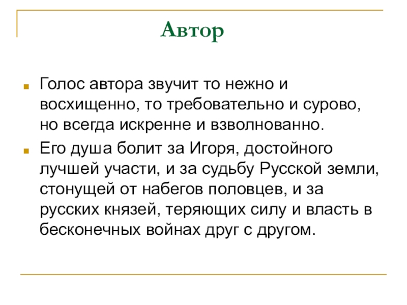 Его душа болит за Игоря, достойного лучшей участи, и за судьбу Русской земли, стонущей от набегов половцев, и за русских князей, теряющих силу и власть в бесконечных войнах друг с другом.