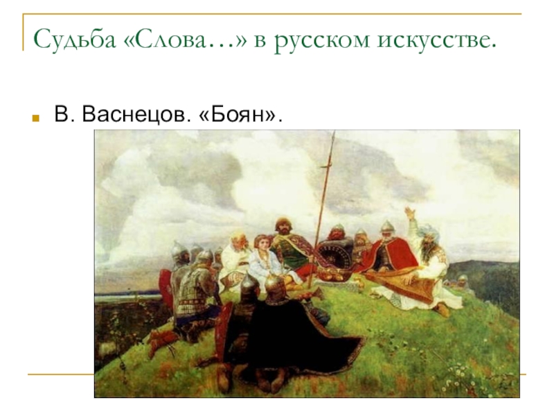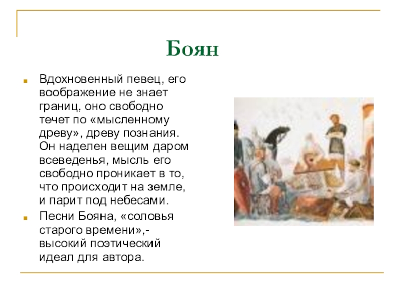 Песни Бояна, «соловья старого времени»,- высокий поэтический идеал для автора.
