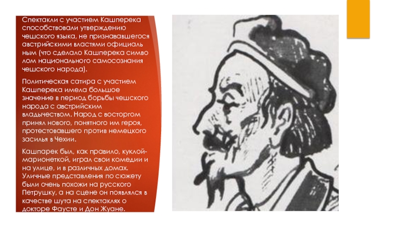 Слайд 16Спектакли с участием Кашперека способствовали утверждению чешского языка, не признававшeгося австрийскими