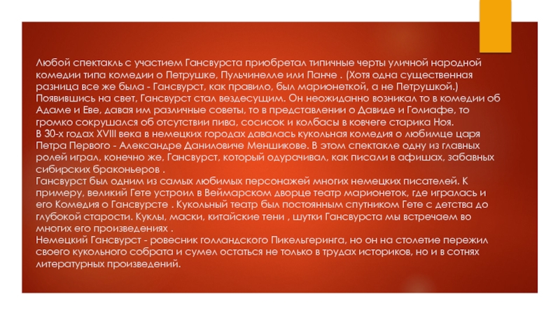 типа комедии о Петрушке, Пульчинелле или Панче . (Хотя одна существенная разница все же была - Гансвурст, как правило, был марионеткой, а не Петрушкой.)