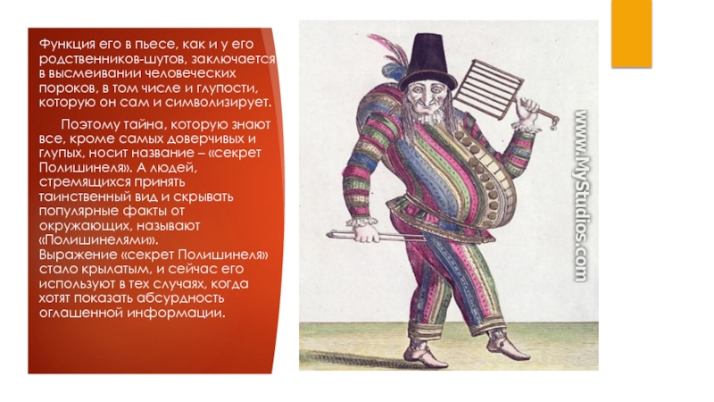 Слайд 10Функция его в пьесе, как и у его родственников-шутов, заключается в