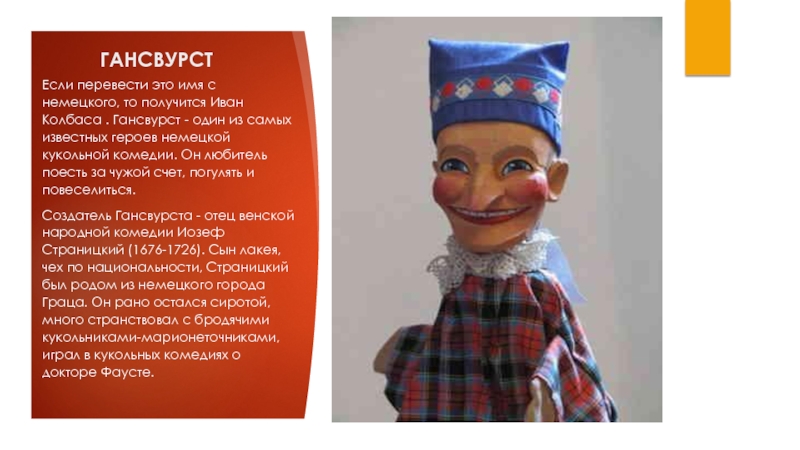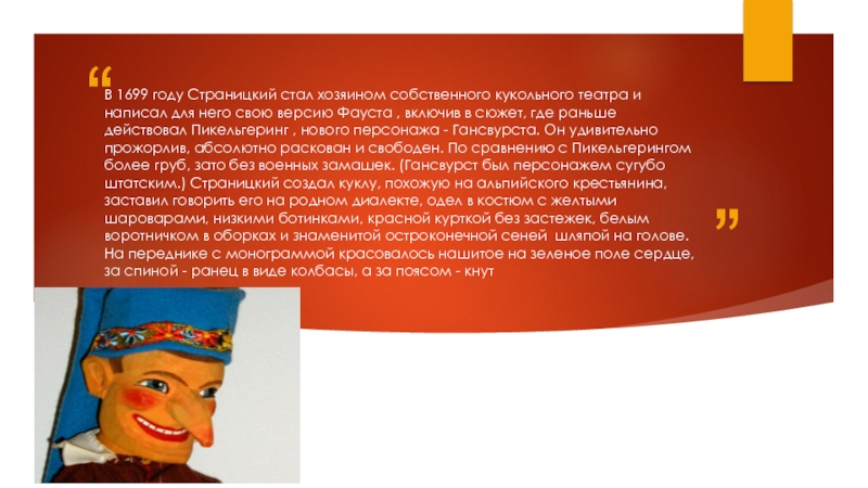 для него свою версию Фауста , включив в сюжет, где раньше действовал Пикельгеринг , нового персонажа - Гансвурста. Он удивительно прожорлив, абсолютно раскован и свободен. По сравнению с Пикельгерингом более груб, зато без военных замашек. (Гансвурст был персонажем сугубо штатским.) Страницкий создал куклу, похожую на альпийского крестьянина, заставил говорить его на родном диалекте, одел в костюм с желтыми шароварами, низкими ботинками, красной курткой без застежек, белым воротничком в оборках и знаменитой остроконечной сеней шляпой на голове. На переднике с монограммой красовалось нашитое на зеленое поле сердце, за спиной - ранец в виде колбасы, а за поясом - кнут
