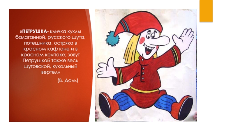Слайд 4«ПЕТРУШКА- кличка куклы балаганной, русского шута, потешника, остряка в красном кафтане