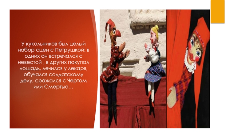 Слайд 5У кукольников был целый набор сцен с Петрушкой: в одних он