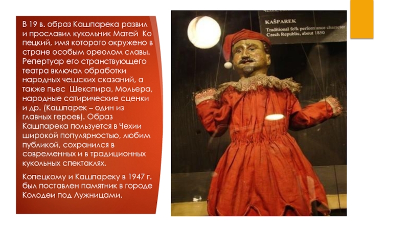 Слайд 17В 19 в. образ Кашпарека развил и прославил кукольник Матей Копецкий, имя которого окружено