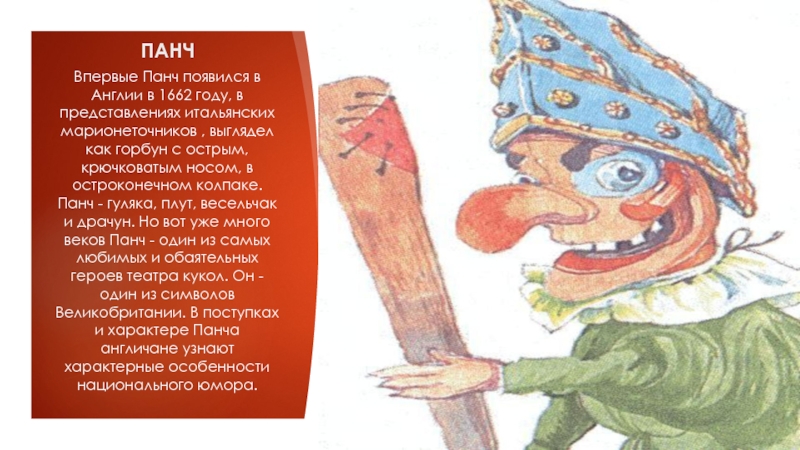 марионеточников , выглядел как горбун с острым, крючковатым носом, в остроконечном колпаке. Панч - гуляка, плут, весельчак и драчун. Но вот уже много веков Панч - один из самых любимых и обаятельных героев театра кукол. Он - один из символов Великобритании. В поступках и характере Панча англичане узнают характерные особенности национального юмора.