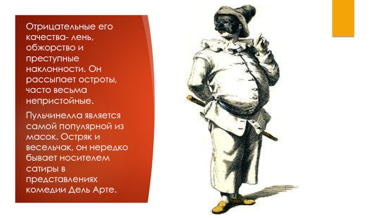 Слайд 8Отрицательные его качества- лень, обжорство и преступные наклонности. Он рассыпает остроты,