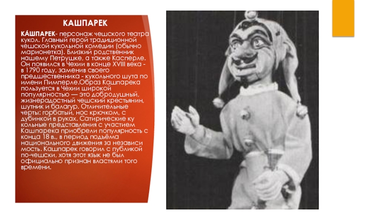 (обычно марионетка). Близкий родственник нашему Петрушке, а также Касперле. Он появился в Чехии в конце XVIII века - в 1790 году, заменив своего предшественника - кукольного шута по имени Пимперле.Образ Кашпарека пользуется в Чехии широкой популярностью — это добродушный, жизнерадостный чешский крестьянин, шутник и балагур. Отличительные черты: горбатый, нос крючком, с дубинкой в руках. Сатирические кукольные представления с участием Кашпарека приобрели популярность с конца 18 в., в период подъёма национального движения за независимость. Кашпарек говорил с публикой по-чешски, хотя этот язык не был официально признан властями того времени.