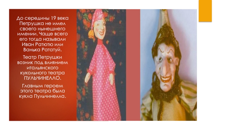 Театр Петрушки возник под влиянием итальянского кукольного театра ПУЛЬЧИНЕЛЛО.