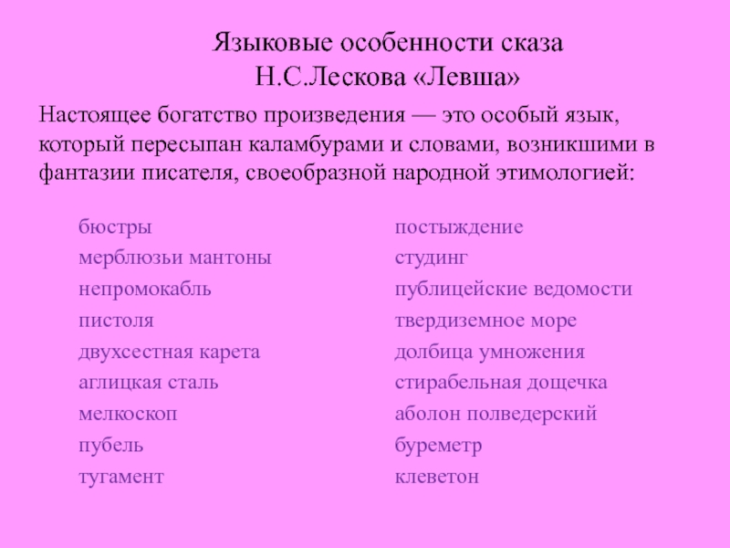 который пересыпан каламбурами и словами, возникшими в фантазии писателя, своеобразной народной этимологией: