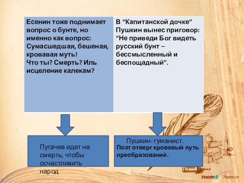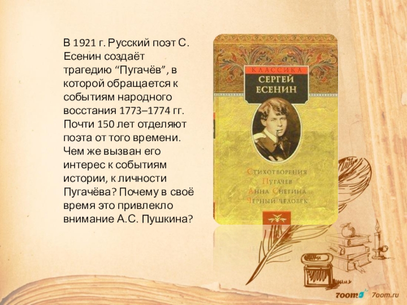 Почему потерпели поражение и дворянские мятежи, и крестьянские бунты? Почему, несмотря на пролитые реки крови, жизненный порядок в России не изменился к лучшему? Можно ли найти иные, более верные пути к благоденствию Родины? Эти вопросы волновали Пушкина, над ними же пришлось задуматься и Есенину.