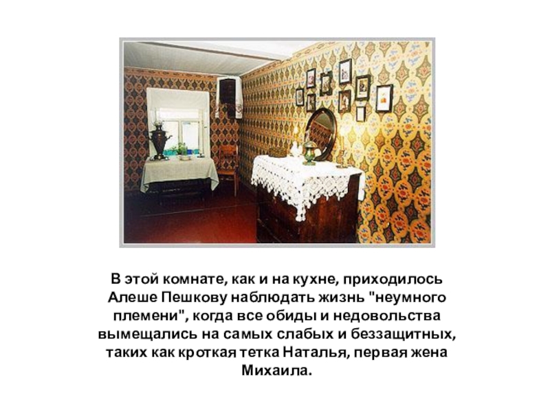 Слайд 8В этой комнате, как и на кухне, приходилось Алеше Пешкову наблюдать