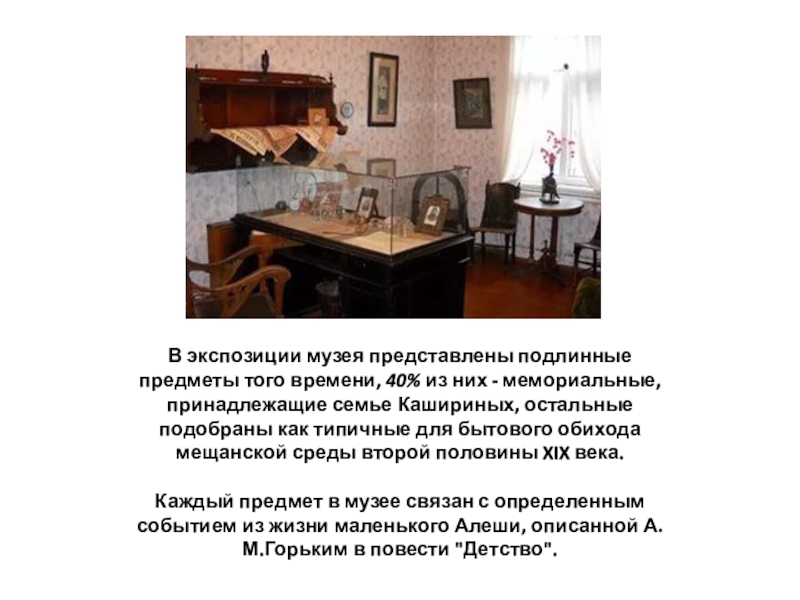 принадлежащие семье Кашириных, остальные подобраны как типичные для бытового обихода мещанской среды второй половины XIX века. Каждый предмет в музее связан с определенным событием из жизни маленького Алеши, описанной А.М.Горьким в повести "Детство".