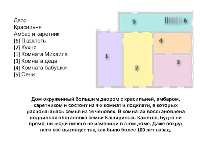 Слайд 4Двор Красильня Амбар и каретник [6] Подклеть [2] Кухня [1] Комната Михаила [3] Комната деда [4] Комната бабушки [5] Сени