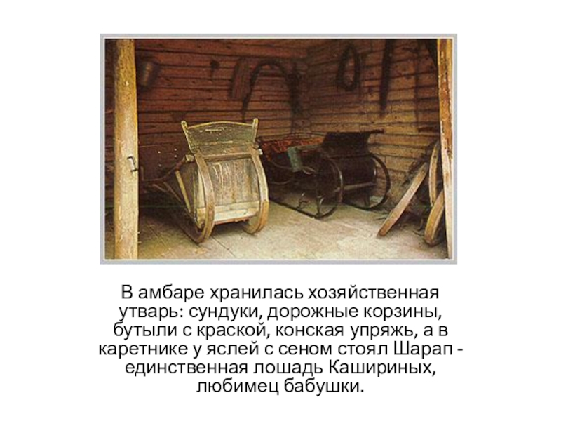 В амбаре хранилась хозяйственная утварь: сундуки, дорожные корзины, бутыли с краской, конская упряжь, а в каретнике у