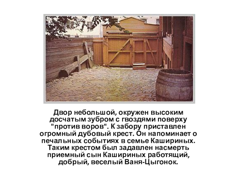 Слайд 5 Двор небольшой, окружен высоким досчатым зубром с гвоздями поверху "против воров". К