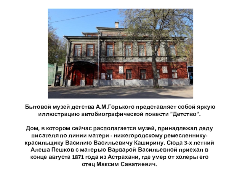 Слайд 2Бытовой музей детства А.М.Горького представляет собой яркую иллюстрацию автобиографической повести "Детство". Дом,