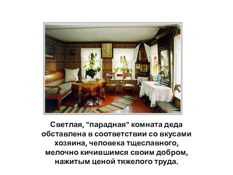 Слайд 9Светлая, "парадная" комната деда обставлена в соответствии со вкусами хозяина, человека
