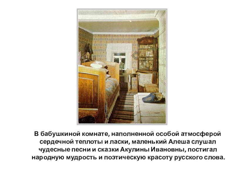 В бабушкиной комнате, наполненной особой атмосферой сердечной теплоты и ласки, маленький Алеша слушал чудесные песни и сказки