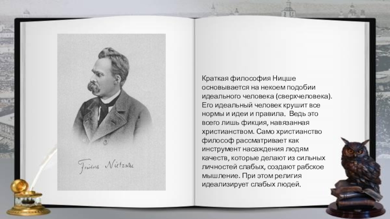 Слайд 4Краткая философия Ницше основывается на некоем подобии идеального человека (сверхчеловека). Его