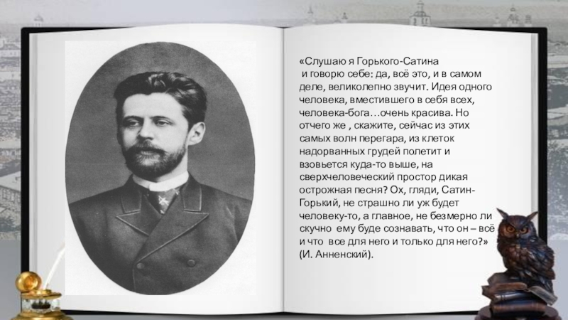 самом деле, великолепно звучит. Идея одного человека, вместившего в себя всех, человека-бога…очень красива. Но отчего же , скажите, сейчас из этих самых волн перегара, из клеток надорванных грудей полетит и взовьется куда-то выше, на сверхчеловеческий простор дикая острожная песня? Ох, гляди, Сатин-Горький, не страшно ли уж будет человеку-то, а главное, не безмерно ли скучно ему буде сознавать, что он – всё и что все для него и только для него?» (И. Анненский).