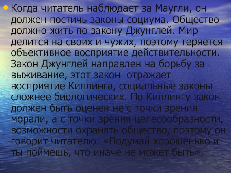 должно жить по закону Джунглей. Мир делится на своих и чужих, поэтому теряется объективное восприятие действительности. Закон Джунглей направлен на борьбу за выживание, этот закон отражает восприятие Киплинга, социальные законы сложнее биологических. По Киплингу закон должен быть оценен не с точки зрения морали, а с точки зрения целесообразности, возможности охранять общество, поэтому он говорит читателю: «Подумай хорошенько и ты поймешь, что иначе не может быть».