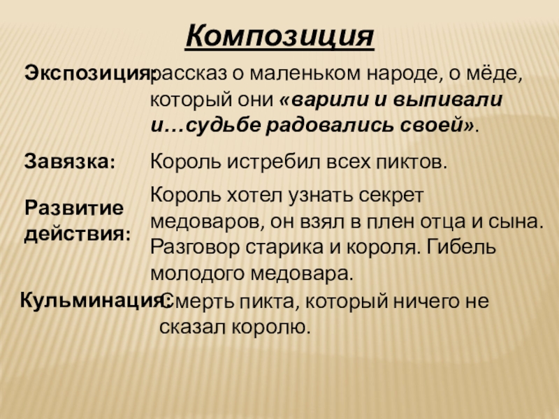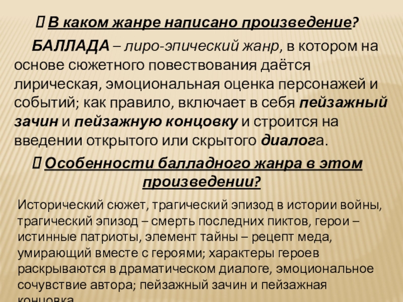 Исторический сюжет, трагический эпизод в истории войны, трагический эпизод – смерть последних пиктов, герои – истинные патриоты, элемент тайны – рецепт меда, умирающий вместе с героями; характеры героев раскрываются в драматическом диалоге, эмоциональное сочувствие автора; пейзажный зачин и пейзажная концовка.