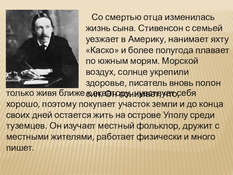 только живя ближе к экватору, чувствует себя хорошо, поэтому покупает участок земли и до конца своих дней остается жить на острове Уполу среди туземцев. Он изучает местный фольклор, дружит с местными жителями, работает физически и много пишет.