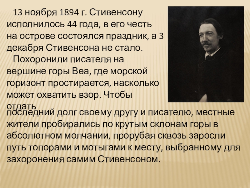 последний долг своему другу и писателю, местные жители пробирались по крутым склонам горы в абсолютном молчании, прорубая сквозь заросли путь топорами и мотыгами к месту, выбранному для захоронения самим Стивенсоном.