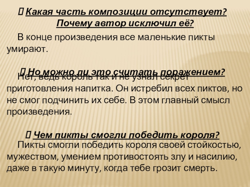 Нет, ведь король так и не узнал секрет приготовления напитка. Он истребил всех пиктов, но не смог подчинить их себе. В этом главный смысл произведения.