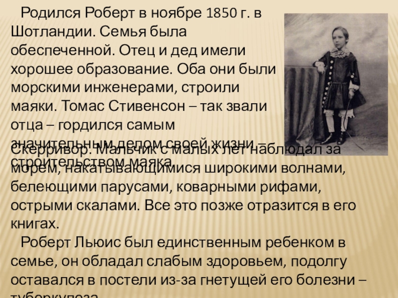 Роберт Льюис был единственным ребенком в семье, он обладал слабым здоровьем, подолгу оставался в постели из-за гнетущей его болезни – туберкулеза.