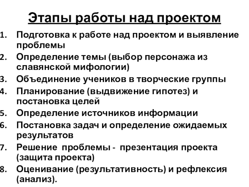 Этапы работы над проектом Подготовка к работе над проектом и выявление проблемыОпределение темы (выбор персонажа из славянской
