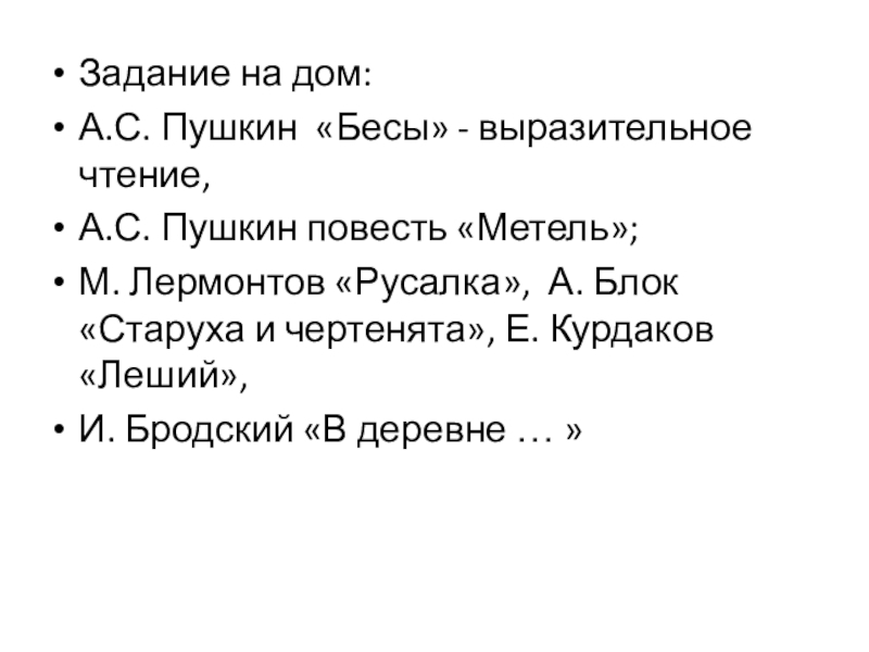 Задание на дом: А.С. Пушкин «Бесы» - выразительное чтение, А.С. Пушкин повесть «Метель»; М. Лермонтов «Русалка», А.