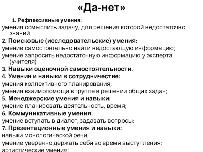 «Да-нет»1. Рефлексивные умения:умения осмыслить задачу, для решения которой недостаточно знаний2. Поисковые (исследовательские) умения:умение самостоятельно найти недостающую информацию;умение