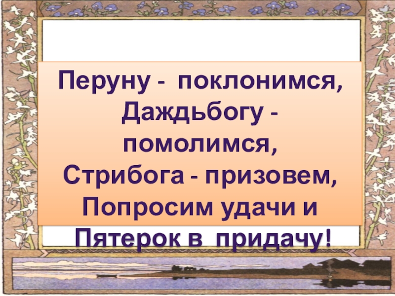 Перуну - поклонимся,Даждьбогу - помолимся,Стрибога - призовем,Попросим удачи и Пятерок в придачу!