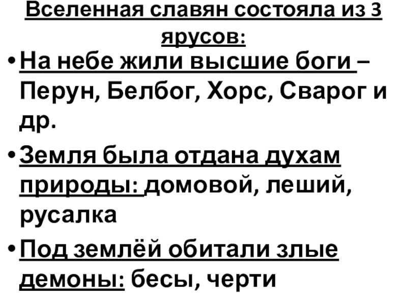 Вселенная славян состояла из 3 ярусов:На небе жили высшие боги – Перун, Белбог, Хорс, Сварог и др.Земля