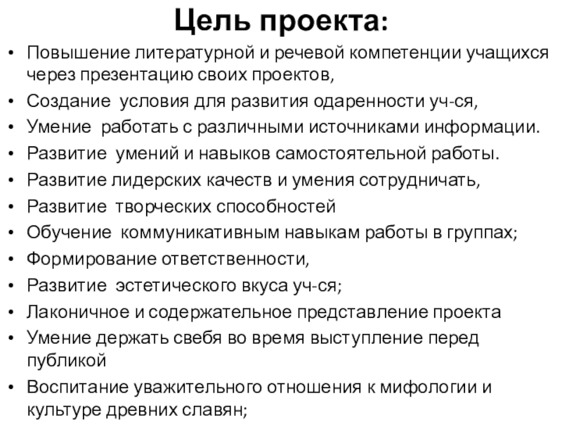 Цель проекта: Повышение литературной и речевой компетенции учащихся через презентацию своих проектов, Создание условия для развития одаренности