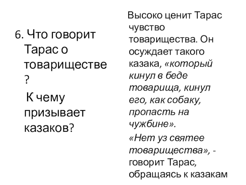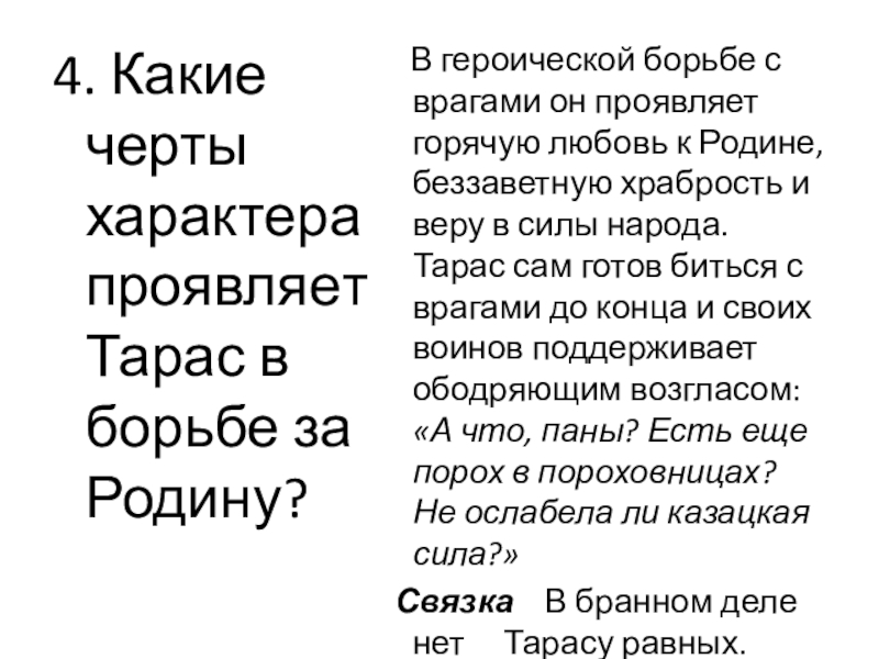 Тарас Бульба – смелый и предусмотрительный атаман. «Выбирайся скорей из-за возов, и садись всякий на коня», - кричит он зычным голосом, увидев приближающегося врага.
