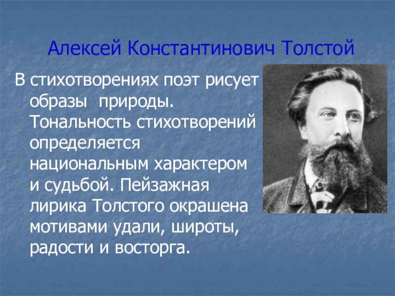 определяется национальным характером и судьбой. Пейзажная лирика Толстого окрашена мотивами удали, широты, радости и восторга.