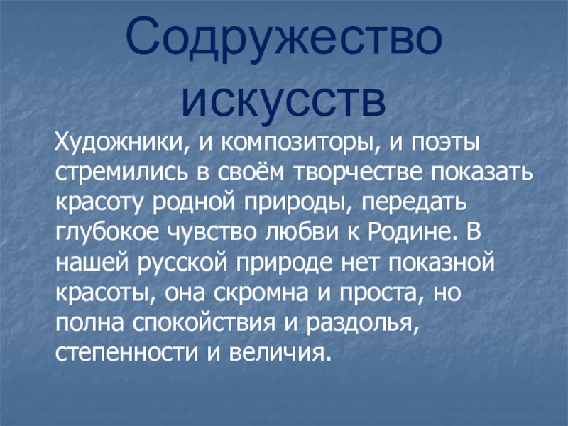 творчестве показать красоту родной природы, передать глубокое чувство любви к Родине. В нашей русской природе нет показной красоты, она скромна и проста, но полна спокойствия и раздолья, степенности и величия.