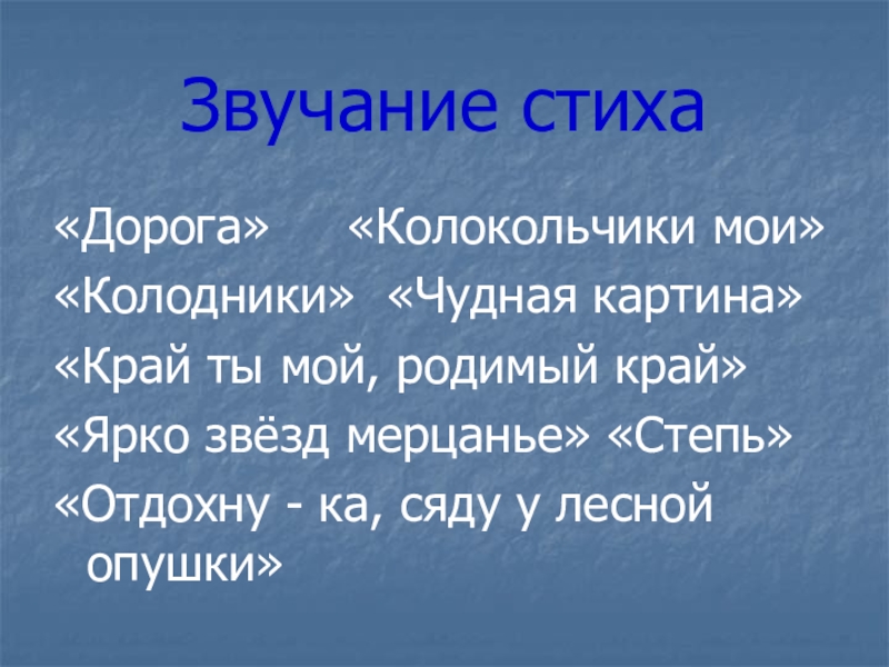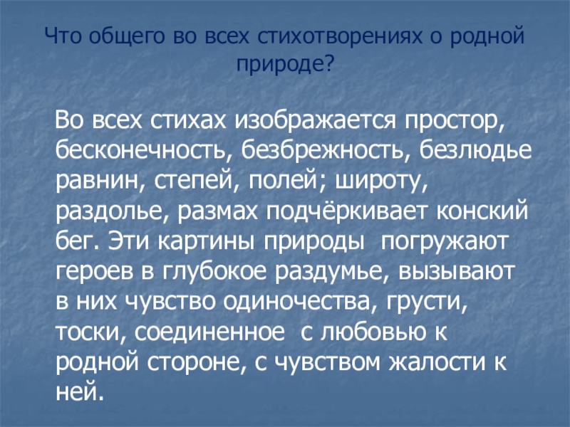 стихах изображается простор, бесконечность, безбрежность, безлюдье равнин, степей, полей; широту, раздолье, размах подчёркивает конский бег. Эти картины природы погружают героев в глубокое раздумье, вызывают в них чувство одиночества, грусти, тоски, соединенное с любовью к родной стороне, с чувством жалости к ней.