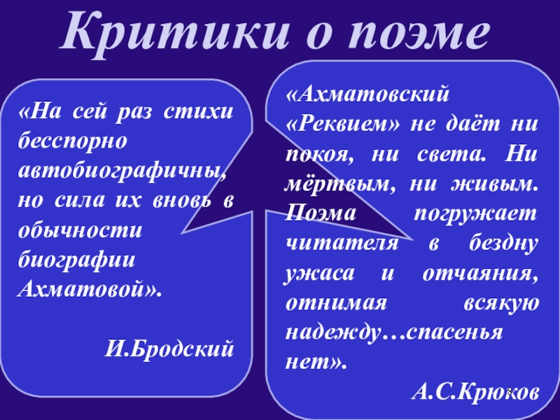 «Ахматовский «Реквием» не даёт ни покоя, ни света. Ни мёртвым, ни живым. Поэма погружает читателя в бездну ужаса и отчаяния, отнимая всякую надежду…спасенья нет».