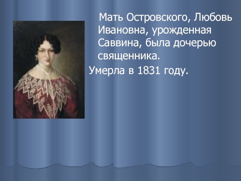 Слайд 8 Мать Островского, Любовь Ивановна, урожденная Саввина, была дочерью священника.