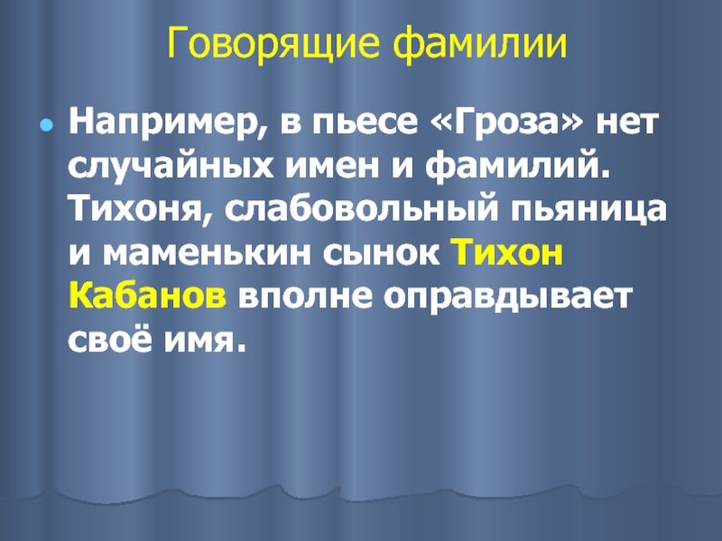 Например, в пьесе «Гроза» нет случайных имен и фамилий. Тихоня,